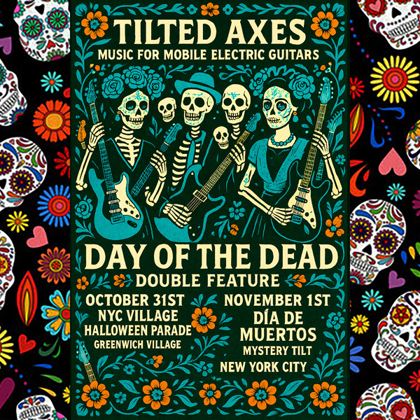 Tilted Axes: Music for Mobile Electric Guitars takes on aspects of spectacle informed by the tradition of urban street bands, avant-garde theater, and ancient music. It takes music out into the world and seeks transformative situations meant to change the conversation through music & movement.