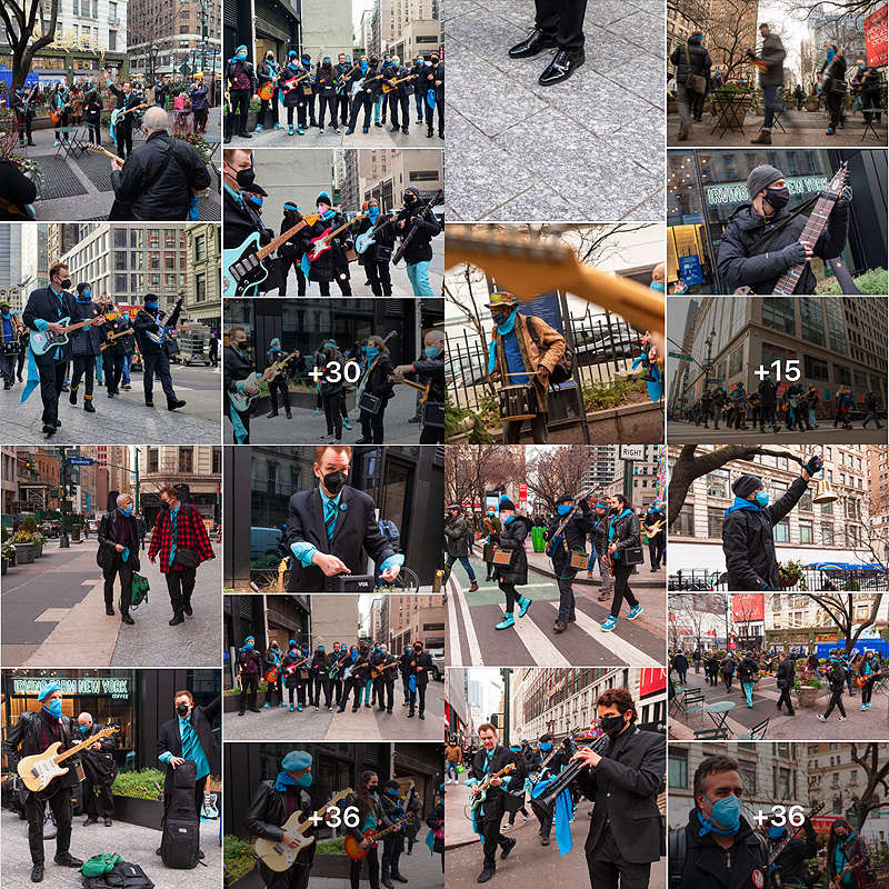 The guitarists of Tilted Axes perform original compositions written specifically for the event by Grant as well as those from the Tilted repertoire, using portable amplifiers strapped to their sides as they walk through the city streets. The outdoor procession of musicians moves along predetermined routes in selected areas, in honor of an event, landmark, or organization unique to that community.