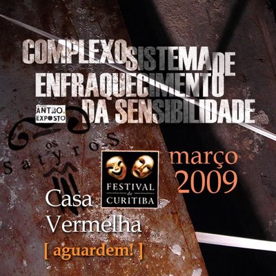 | JULY 3-11, 2009 SESC Copacabana Rio de Janeiro, Brazil COMPLEXO SISTEMA de Enfraquecimento da Sensibilidade written & directed by Ruy FILHO original music by Patrick GRANT Cia. Antro Exposto ![]() foto by Patricia Cividanes COMPLEXO SISTEMA de Enfraquecimento da Sensibilidade Concepção, texto e direção RUY FILHO Música original PATRICK GRANT com DIEGO TORRACA, GUILHERME GORSKI, GABRIELA ROSAS, GIULIANA ROCHA, RAIANNI TEICHMANN e TIAGO TORRACA Cenografia e iluminação e operações de som e luz RUY FILHO Figurinos JUNIA PAIVA Preparação de ator GUSTAVO SOL Preparação de ator convidado ALEXANDRE CAETANO Fotografias e Design Gráfico PATRÌCIA CIVIDANES Fotógrafo convidado FRED MESQUITA Registro em DVD e edição final THIAGO DE MELLO Produção CIA. DE TEATRO ANTRO EXPOSTO Realização CIA. DE TEATRO ANTRO EXPOSTO E CENTRO CULTURAL RIO VERDE Check out the Cia. Antro Exposto blog HERE ================================================= |