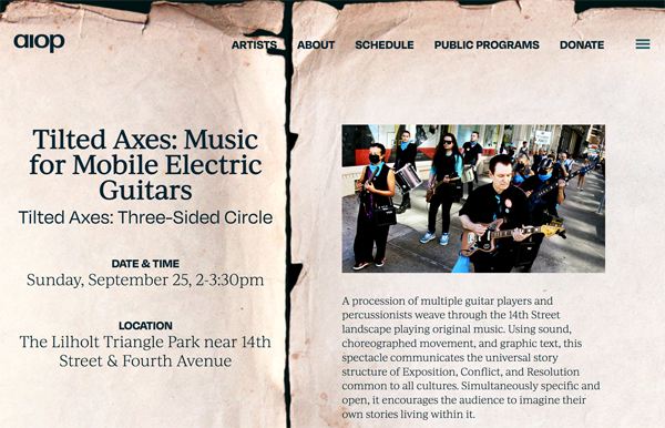 Combining the energy of rock, the creative discipline of theater, and the experimental spirit of the downtown NYC arts scene, Tilted Axes is both a processional event, and an ensemble of mobile electric guitarists created by composer/performer Patrick Grant.