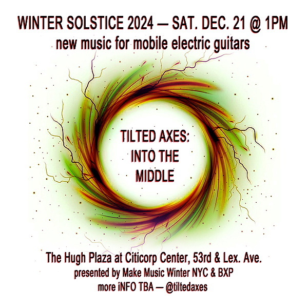 For Make Music Winter NYC 2024, innovative new music group Tilted Axes: Music for Mobile Electric Guitars, returns to The Hugh plaza at Citicorp Center with a new program, “Into the Middle,” consisting of original music and solstice sounds. People will be asked to participate in this interactive sonic adventure. Follow us for details.